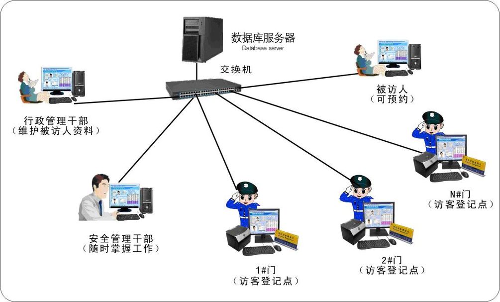 在單位出入口建立一套信息化的來訪登記系統(tǒng),控制和管理臨時訪客人員進出。該系統(tǒng)的建成便于人員的合理流動,對進出的人員實行靈活多樣的管理。